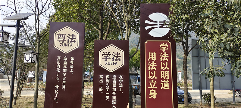 新明乡猴坑村法治文化广场坐落于太平猴魁核心产区——猴坑村村委会门口,建成于2020年11月,占地面积约200平方米,广场入口设有“法治广场”标识牌,围绕广场立有10块宣传牌,宣传内容涉及宪法、民法典、乡村振兴促进法等相关法律法规。
